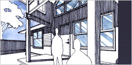 The design baseline is the Habitat for Humanity plan with significant improvements. The tall ceilings and grand room, experienced upon entering the house, are bright, spacious, and inviting. The volume of the space and selective window placements contribute to the vivid open atmosphere. The plan is flexible: additional bedrooms and/or a bathroom are readily added, per the owner's budget. The design includes broad overhangs that minimize heat gain and reduces cooling costs, protects against the elements and therefore extends the materials' life, and controls lighting. The latter allows residents to enjoy the benefits of natural light illumination without having to bear intense sunlight in the summer, yet allows warming sunshine in during the winter. Also, different roofing systems results in a variety of elevations that add character to the neighborhood, and avoids the repetitive "cookie-cutter look."